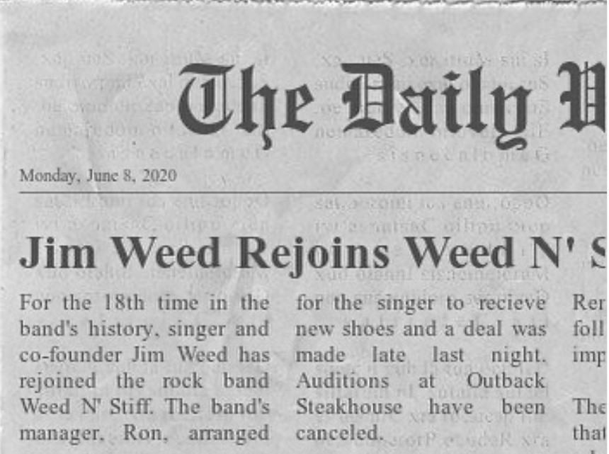 The mighty comedic duo Weed N’ Stiff are back with a 15 track full length album entitled “Ron,” dropping June 3rd. Ron, the character in the WNS universe, is the band’s bumbling Manager mostly known for holding auditions at Outback Steakhouse every time Jim Weed quits the band.